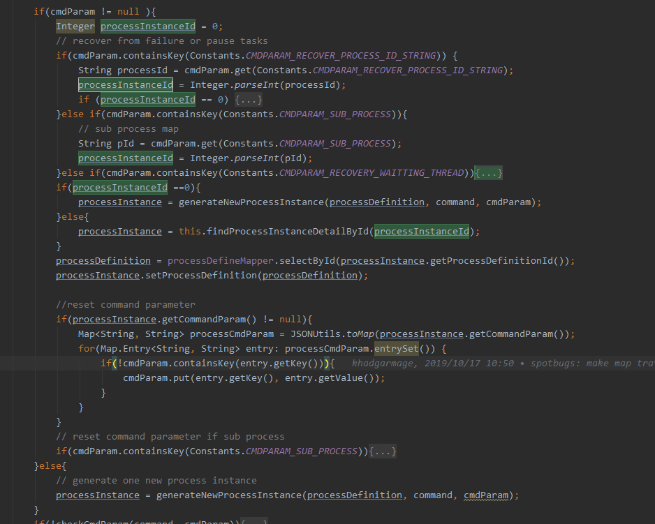 if (command != null) {logger.info(String.format("find one command: id: %d, type: %s", command.getId(),command.getCommandType().toString()));try{processInstance = processDao.handleCommand(logger, OSUtils.getHost(), this.masterExecThreadNum - activeCount, command);if (processInstance != null) {logger.info("start master exec thread , split DAG ...");masterExecService.execute(new MasterExecThread(processInstance,processDao));}}catch (Exception e){logger.error("scan command error ", e);processDao.moveToErrorCommand(command, e.toString());}}