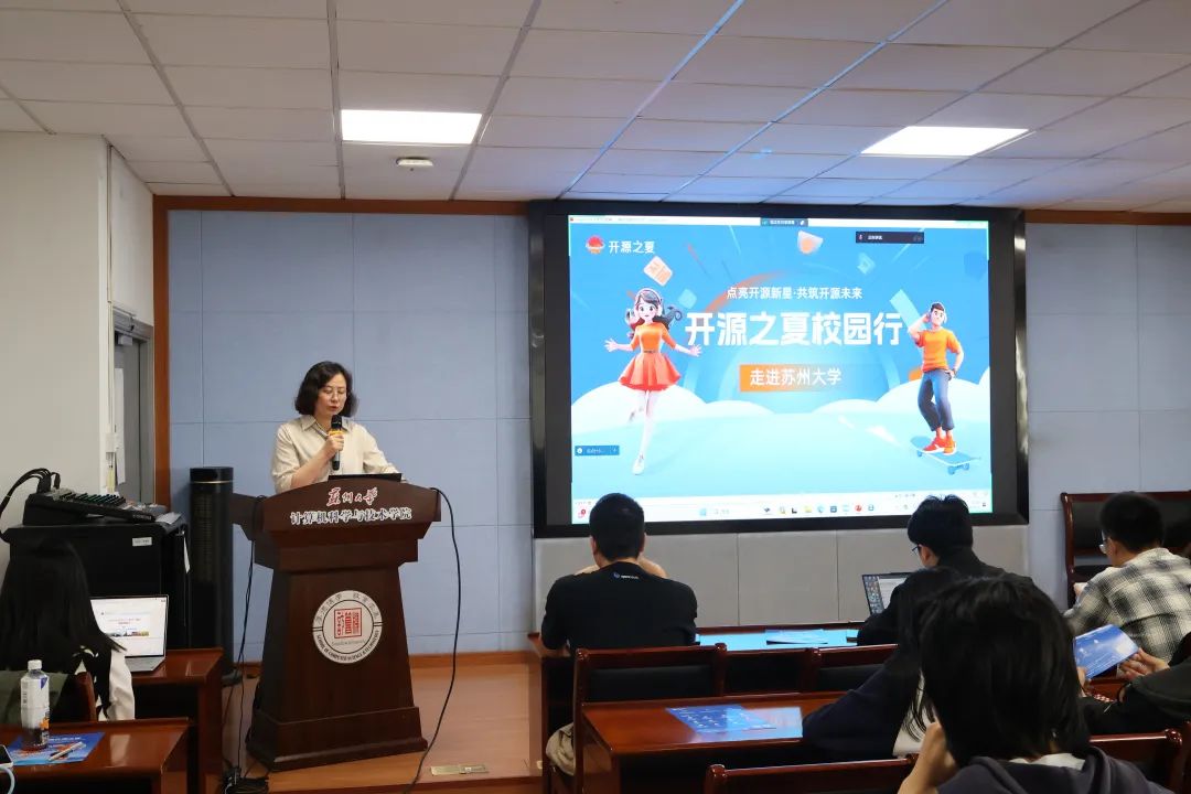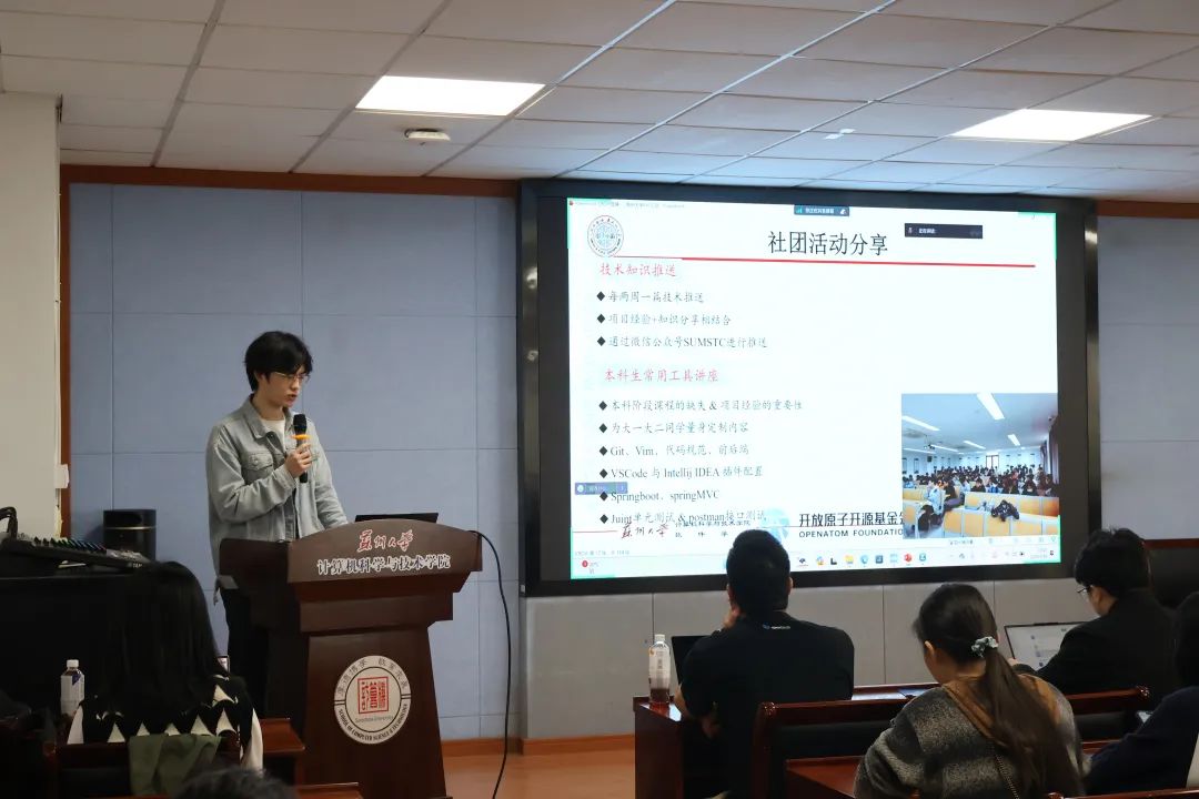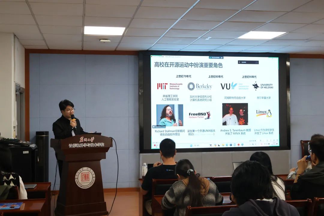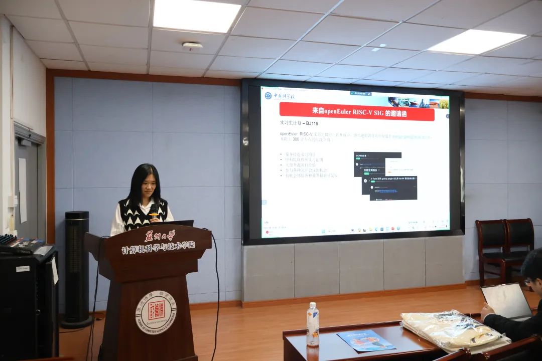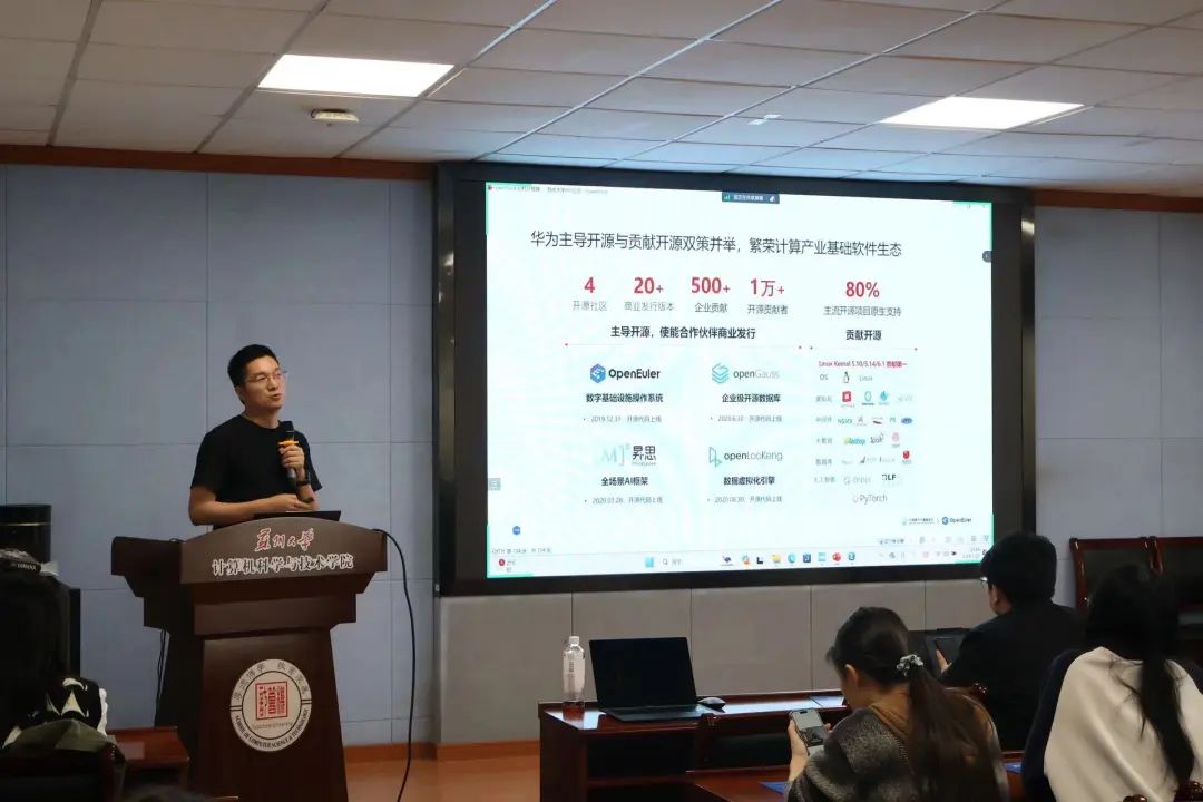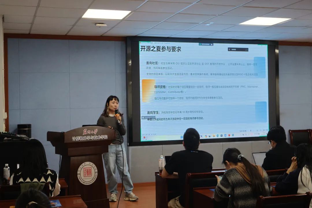 openEuler&openGauss社区运营经理梅相如介绍了在华为主导开源与贡献开源双策并举下蓬勃发展的面向数字基础设施的开源操作系统——openEuler和面向数字基础设施的开源数据库——openGauss,并与同学们分享如何参与社区贡献的流程以及开源之夏项目任务。