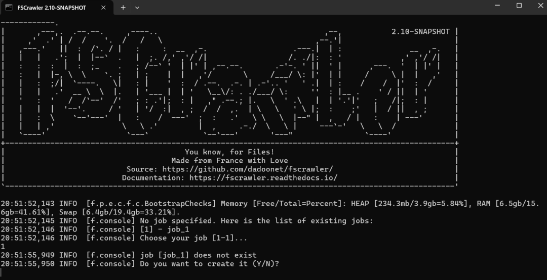 在配置文件设置完毕后,使用命令行启动 FSCrawler,命令如下: