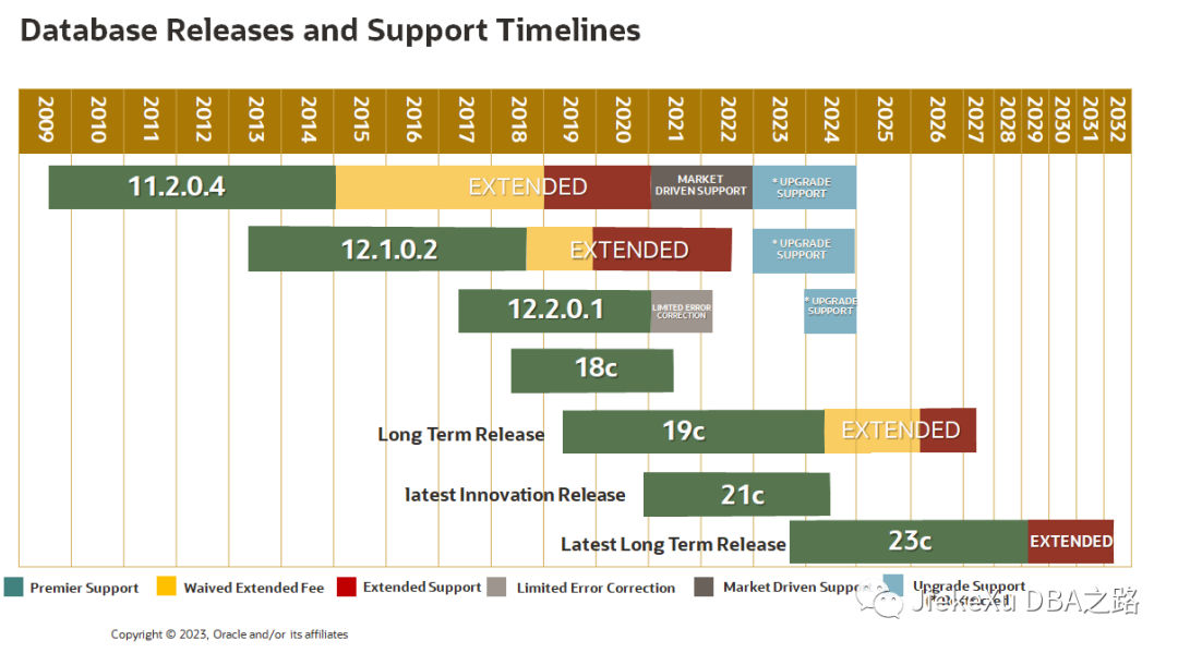这里先为大家附上 Oracle 各版本支持的生命周期及发布时间线,当前较为常用的主流版本则为 Oracle 11g 和 Oracle 19c 以及明年发布的 Oracle 23c 等版本,12c 和 18c 以及 21c 版本非长期支持版本,不建议在生产环境中使用。本文是对 11g 和 19c 两个主流版本的单机文件系统、单机 ASM 和 RAC 三种架构的静默安装简要步骤,并不包含所有操作步骤,仅供参考。另外第四章节是半年前对 Oracle 23c free 版本的安装,感兴趣的朋友也可参考安装最新版本的安装包。