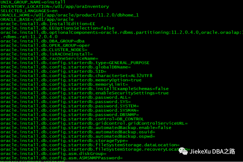 cat /u01/soft/database/response/db_install.rsp | grep -v ^# | grep -v ^$ > /home/oracle/db_install.rsp