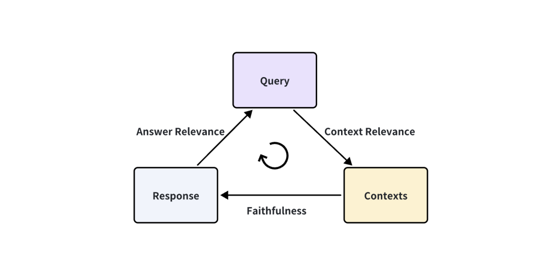 在 RAG 应用是一个黑盒的情况下,我们只能访问这三个信息:用户提问(User's query)、RAG 系统召回的引用上下文(retrieved contexts)、RAG 系统的回答(RAG's response)。它们是 RAG 整个过程中最重要的三元组,两两相互牵制。我们可以通过检测这三元组之间两两元素的相关度,来评估一个 RAG 应用的效果。