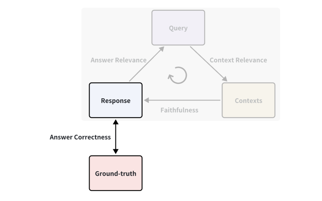 大家可能已经注意到了,上面的例子里并没有用到 ground-truth,它是人类写好的可以回答对应提问的标准回答。比如可以定义 Ground-truth 和 Response 之间的一种指标,叫作 Answer Correctness,它是用来衡量 RAG 回答的正确性的。打分原理和上文 Answer Relevance 使用 LLM 打分的方式是一样的。