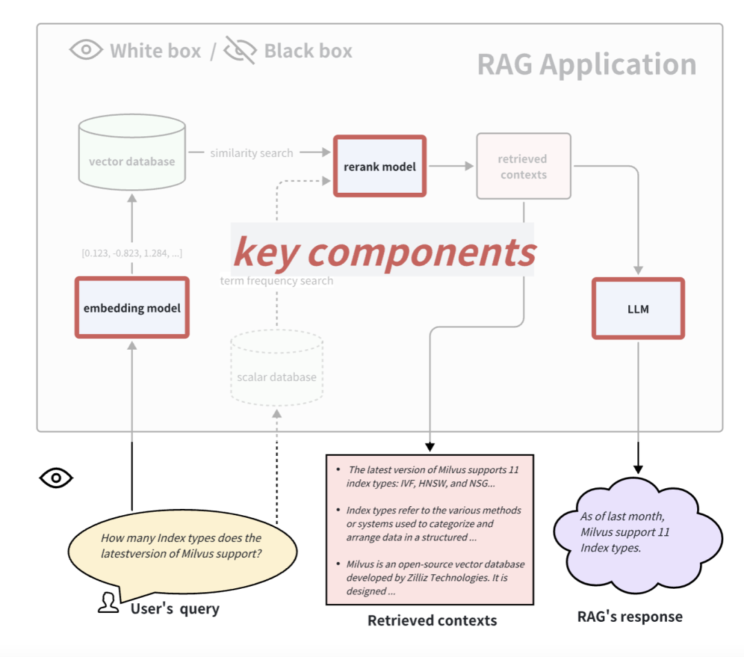 当以白盒方式来评估 RAG 应用时,我们能看到 RAG 应用的内部所有流程。因此内部的一些关键组件就可以决定这个 RAG 应用表现的好坏。以常见的 RAG 应用流程为例,一些关键的组件包括 embedding model、rerank model 和LLM。有的 RAG 具备多路召回能力,可能还会有 基于词频的搜索方法(term frequency search) 算法,更换和升级这些关键组件也能为 RAG 应用带来更好的效果。白盒方式可以用来评估开源 RAG 应用,或者提升自研 RAG 应用。