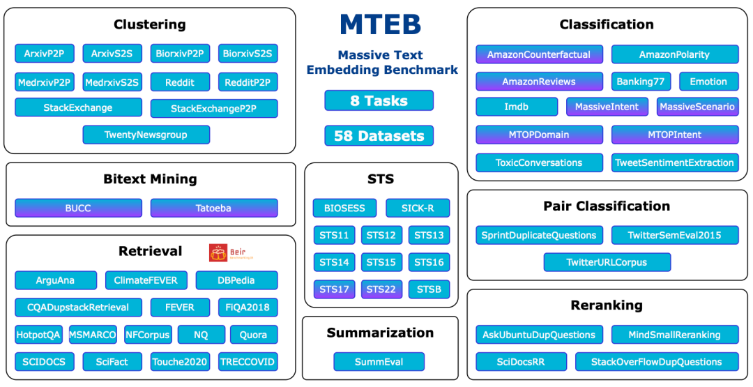 Massive Text Embedding Benchmark(MTEB)是一个全面的基准,旨在评估文本嵌入模型在各种任务和数据集上的性能。MTEB 涵盖了 8 个嵌入任务,包括双语挖掘(Bitext Mining)、分类、聚类、成对分类、重新排序、检索、语义文本相似度(STS)和摘要。它涵盖了总共 58 个数据集,跨越了 112 种语言,使其成为迄今为止最全面的文本嵌入基准之一。