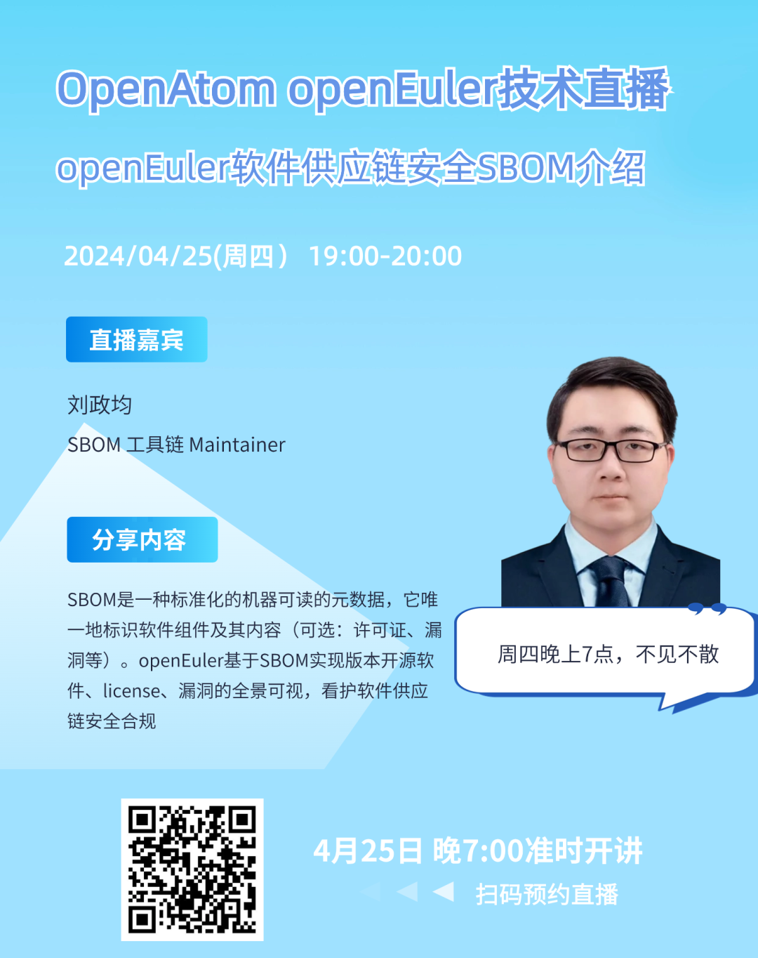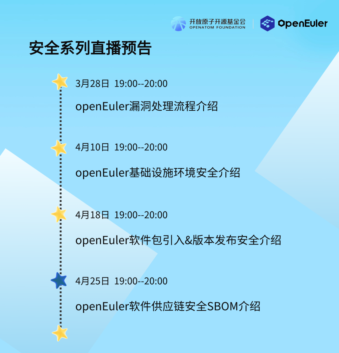 嘉宾来自openEuler社区安全委员会、基础设施SIG、Release SIG、SBOM工具链负责人。分享openEuler社区安全漏洞处理、基础设施环境安全介绍等更多精彩内容。