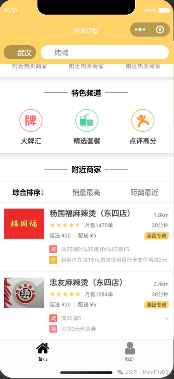 本示例是一个简单的外卖查看店铺点菜的外卖微信小程序,小程序后端服务使用了MemFire Cloud,其中使用到的MemFire Cloud功能包括: