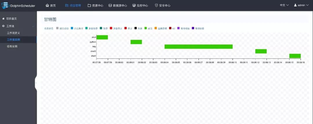 支持工作流运行历史树形/甘特图展示、支持任务状态统计、流程状态统计