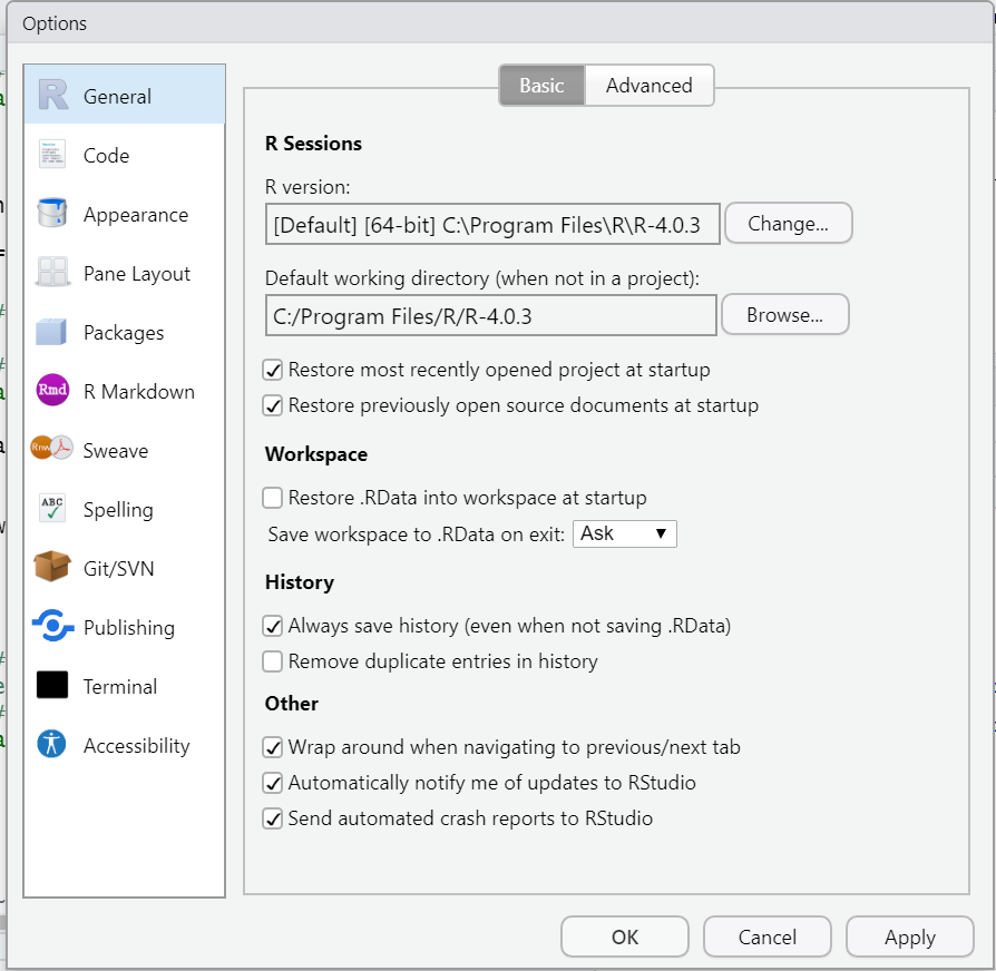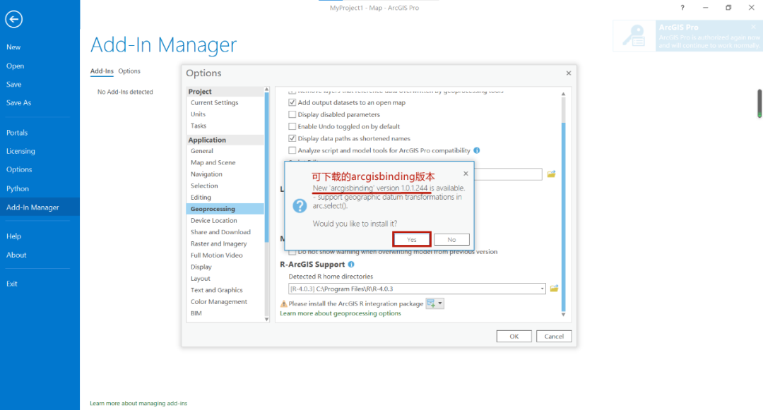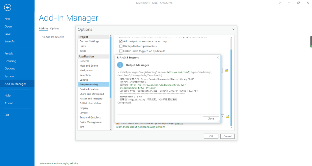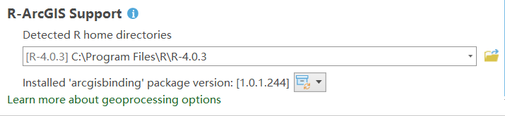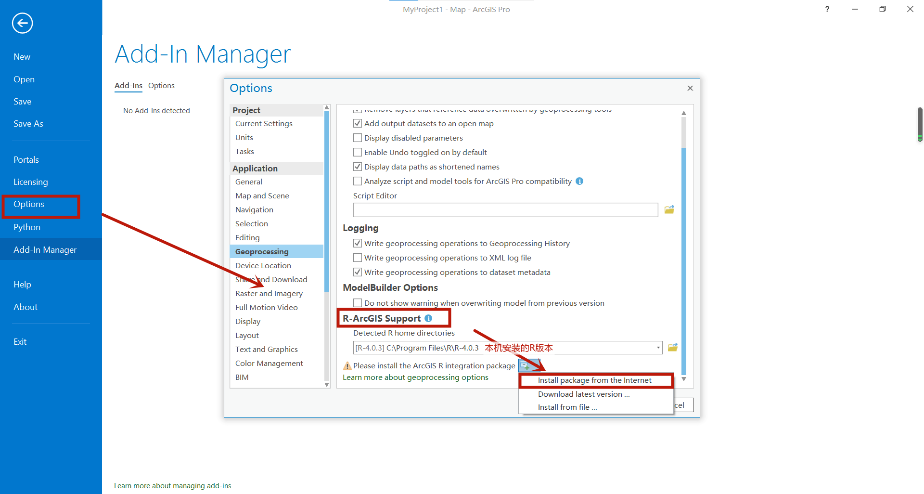 安装arcgisbinding 最简便的途径是在本机中安装R和RStudio,并在ArcGIS pro中进行下载安装。在ArcGIS pro中,选择options选项卡,并选择Geoprocessing选项。在R-ArcGIS Support下方选择本机的R版本。选择install from the internet: