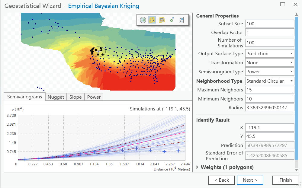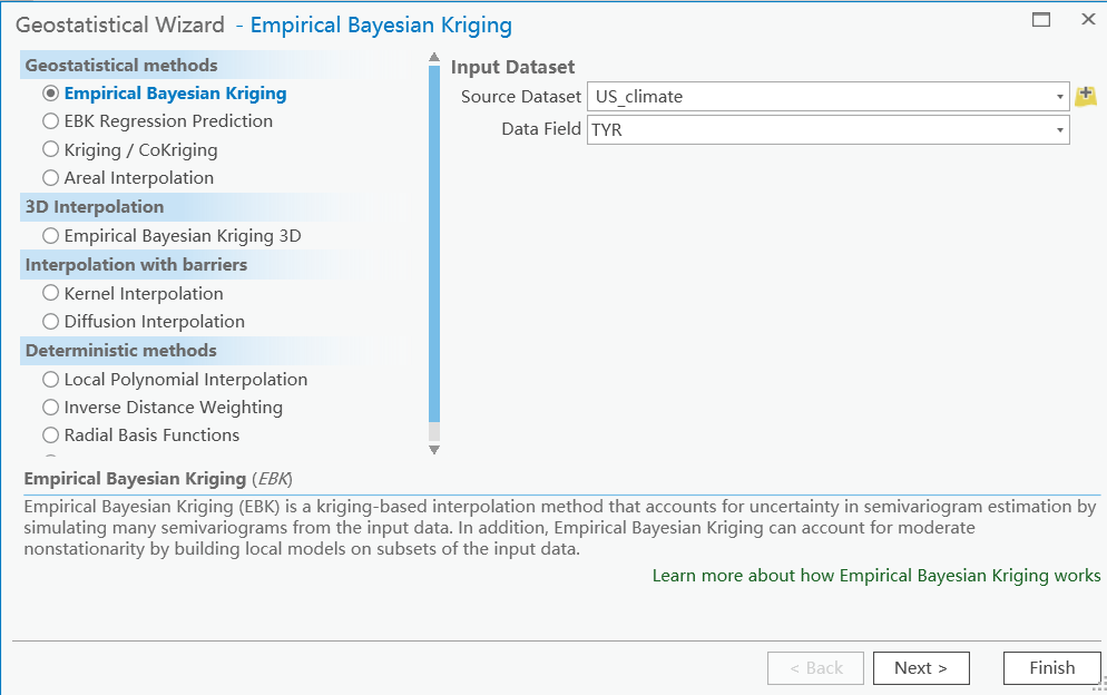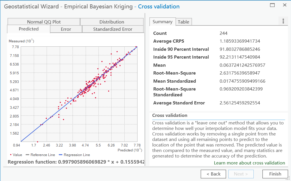 模型建立之前,需要对预测变量进行回归分析,并选定一个目标变量(观测站记录的气温或降水),安装python库和R库之后,分析预测变量之间的关系,通过探索性回归模型的方法来建立变量和气候观测站记录的数据之间的关系。本文中我们将选用克里金插值方法来对平均气温和降水进行插值计算,选择Empirical Bayesian Kriging方法,对月平均气温进行差值计算: