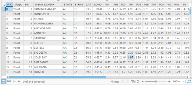 查看包含CGM数据的矢量文件:当前的字段包括GCM变量获取的观测时间,包括美国248个城市的气象观测站,共记录47191条数据。每个气象观测站的表格包括了从2005到2010不同日期的多条观测数据。