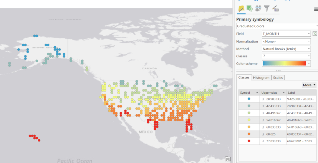 US_climate矢量数据包括了月平均温度(T_MONTH)以及平均降水量(P_MONTH)。展示2006年起美国248个城市的长期气候数据。