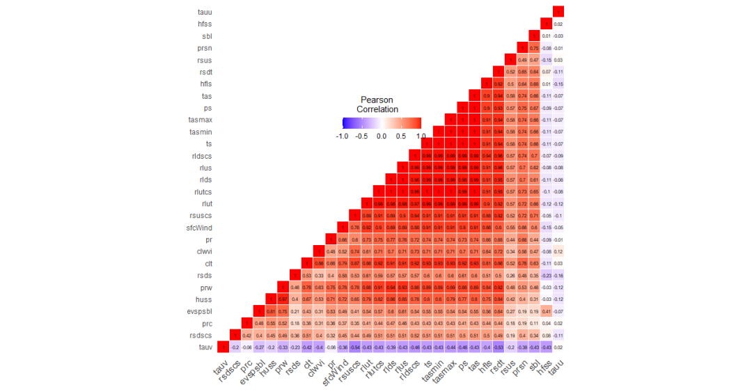 查看属性表:属性表包含32个GCM气候变量,可以用来创建温度模型,下表包含了每一个变量的解释。下一步,我们将使用回归矩阵来观察是否存在变量之间的多重共线性。首先我们创建一个线性回归模型,这一模型需要明确与目标变量线性相关的预测变量,而这一预测变量与其他预测变量非线性相关。