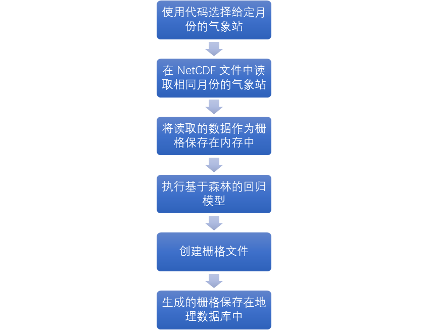 上文已经使用了不同的回归方法,这一步将使用随机森林模型为所有使用GCM变量训练的大气监测站预测局部月平均温度。数据源包含了不同的气候监测站记录的不同时段的温度。使用随机森林来学习时间和空间的不同模式。来研究平均温度和GCM变量之间的关系。随机森林和回归分析产生不同的结果,本文将根据这些结果来预测每年的每个月的气温。