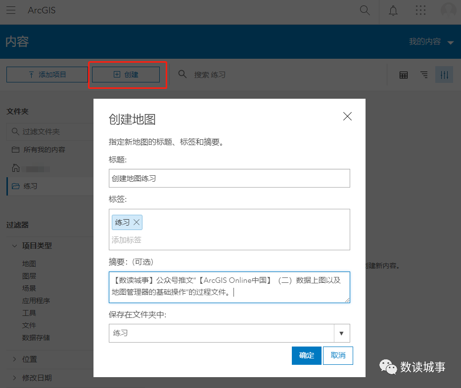 登陆后直接点击【内容】,然后点击【创建】—【地图】,进行创建地图的操作。依次输入标题、标签摘要(可选),然后选择要保存到的文件夹。点击确定。