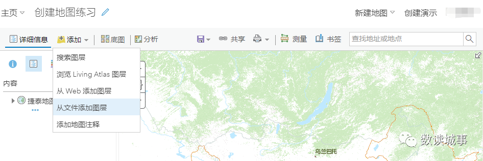 默认的底图是“泰捷地图彩色版”,接下来可以通过“添加”来添加图层。添加图层的方式有四种: