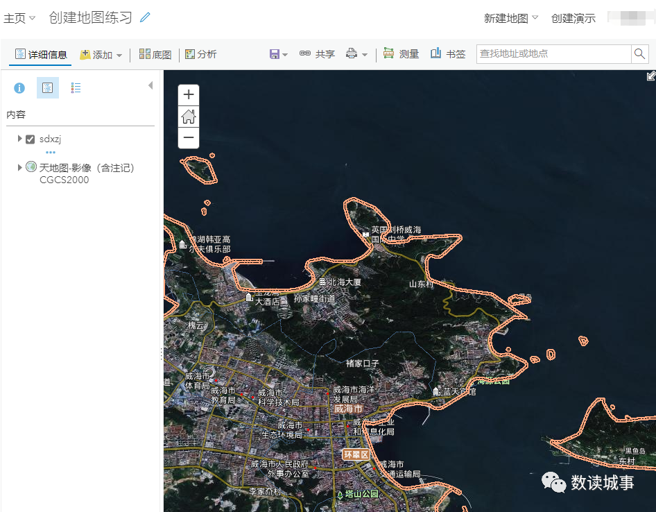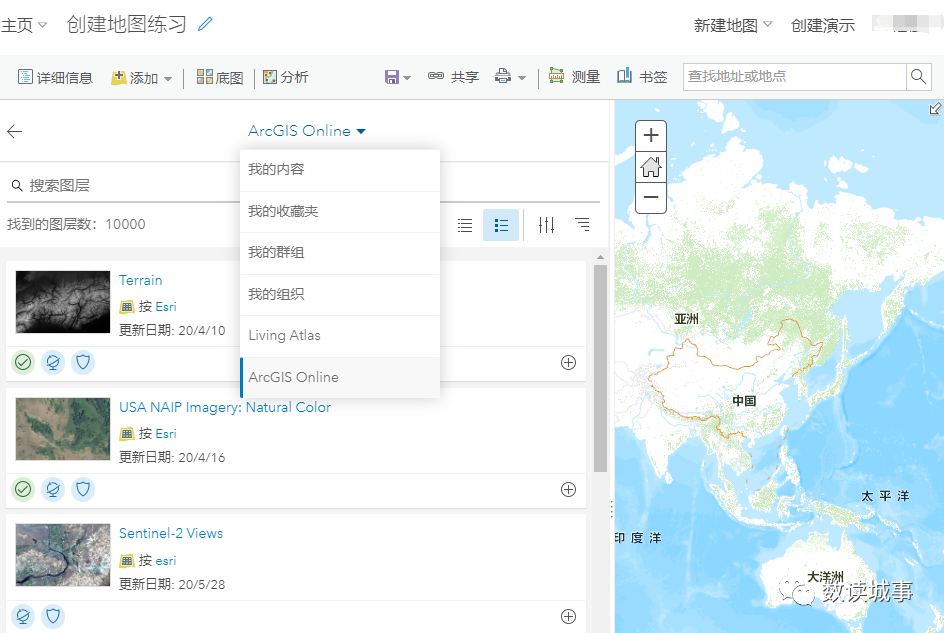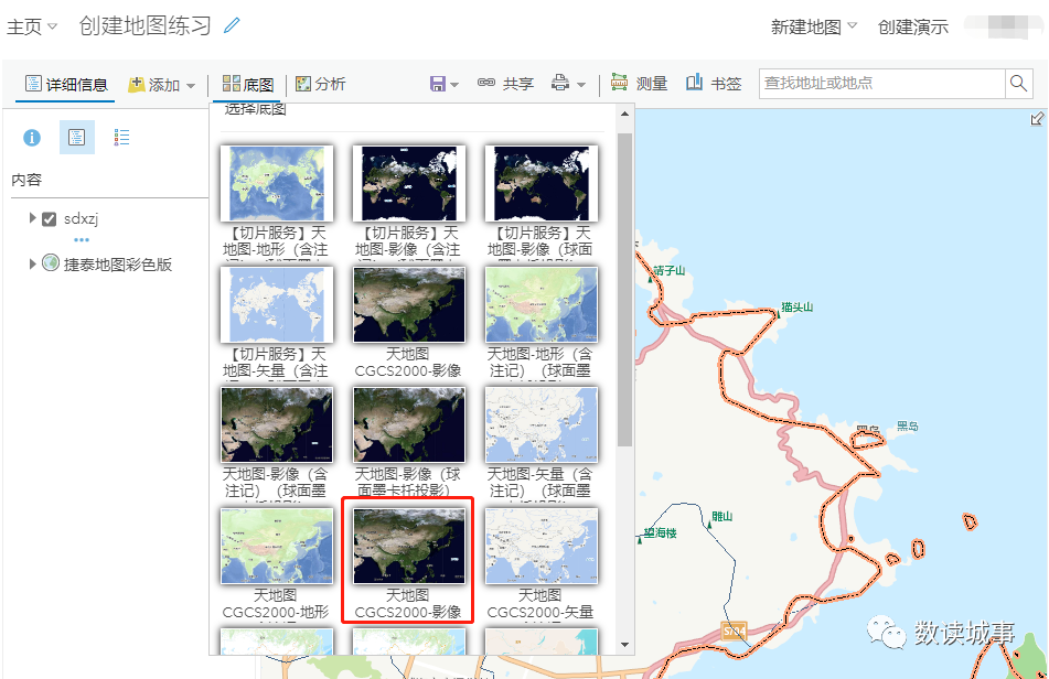 【ArcGIS online中国】提供了丰富的底图资源,我们直接换一个底图,比如换成“天地图CGCS2000_影像”,这下就没有偏移了。