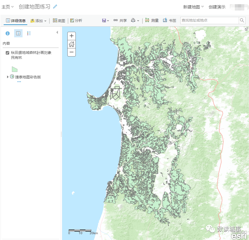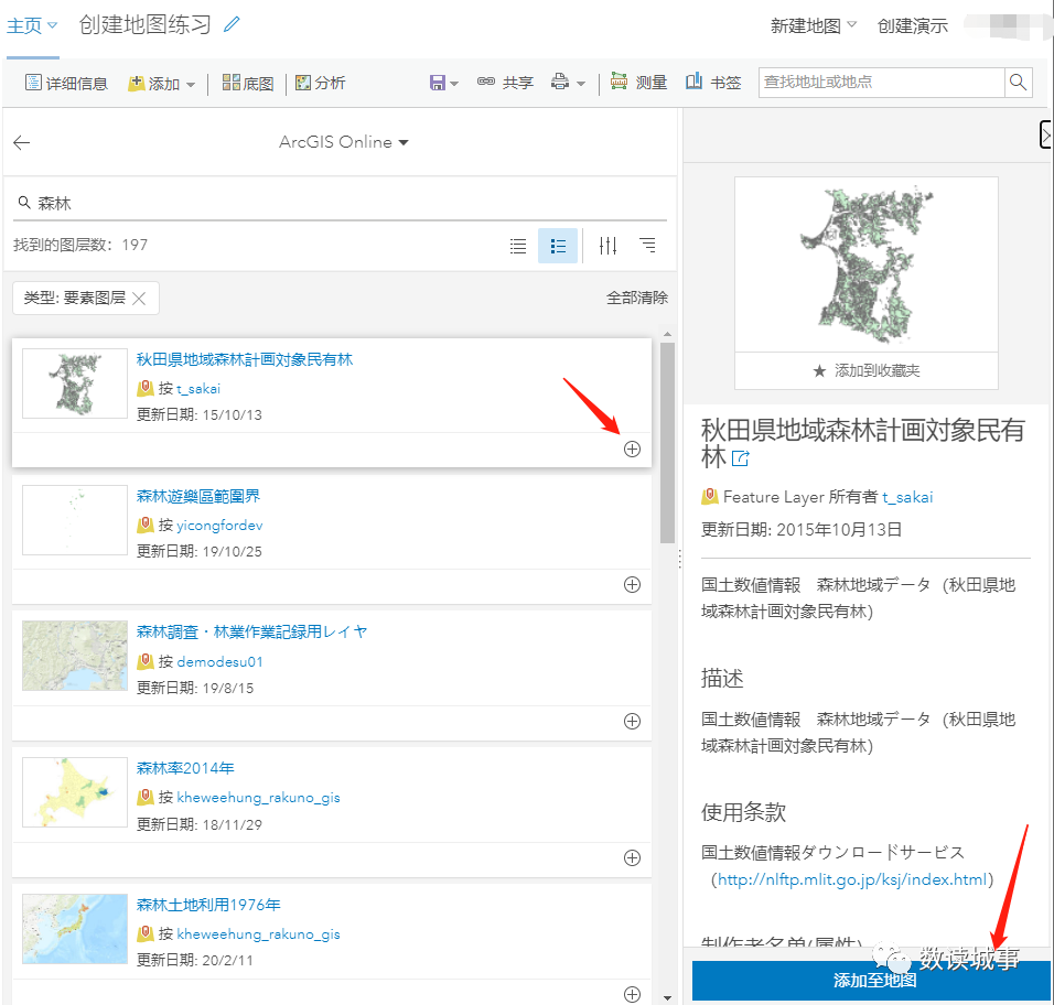比如我在“ArcGIS Online”中搜索关键词“森林”,将出现在第一列的要素图层添加至地图,它就添加到了我们创建的地图中。暂时用不到它,直接点击“...”选择“移除”。