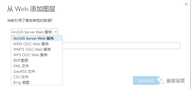 然后回到【ArcGIS online中国】,使用【从Web添加图层】,在选择【WMS OGC Web 服务】后,在URL中输入刚刚复制的服务地址。