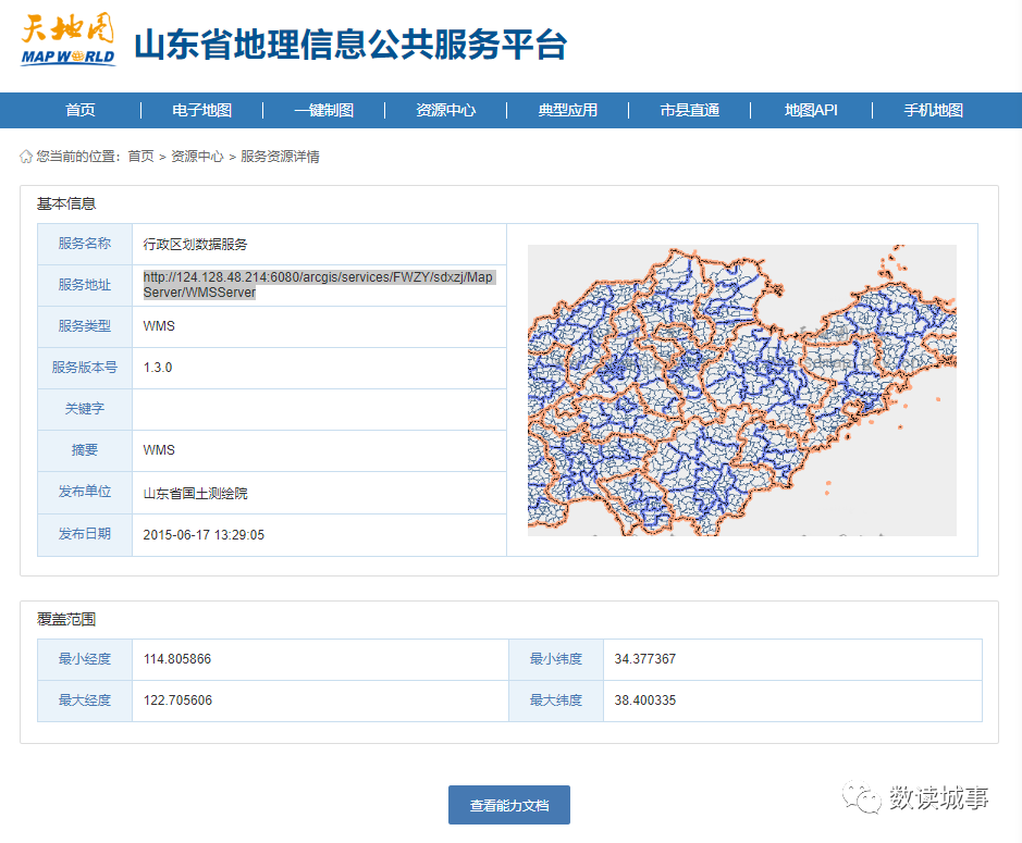 我们以WMS为例进行尝试。打开山东天地图网站,在资源中心随便找一个服务资源,复制他的服务地址: