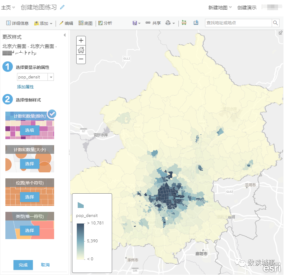 导入数据后,会提示选“选择要显示的属性”,我们选择“pop_densit"(人口密度)后,会发现系统给出了多种绘制样式。这配色比ArcMap高级多了。选择“计数和数量(颜色)”来进行绘制。点击【选项】进行更多设置。然后点击完成即可。