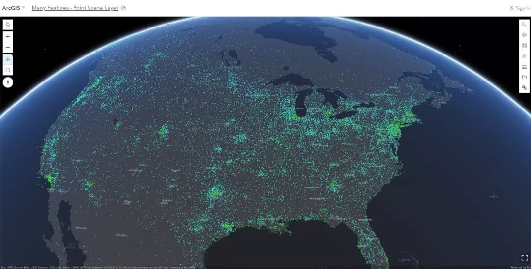 刚刚提到的是点要素图层。如果在场景中使用点的scene图层,将会具有相同的出色表现,并且可以改善场景中点的绘制。你会发现经过改进和细化的这个版本,可以显示出更多的点要素。如果你的点要素相互重叠在一起,你可以通过配置图层提升整体显示的效果。