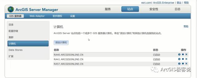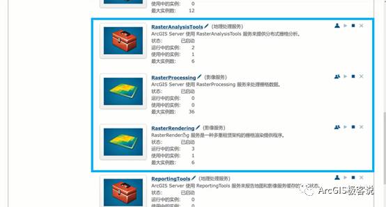 在Server Manager页面可以查看栅格大数据后台分布式部署及运算原理——通过三台计算机搭建的一个影像服务器集群,其计算资源以实例的形式预分配给多个GP服务使用。
