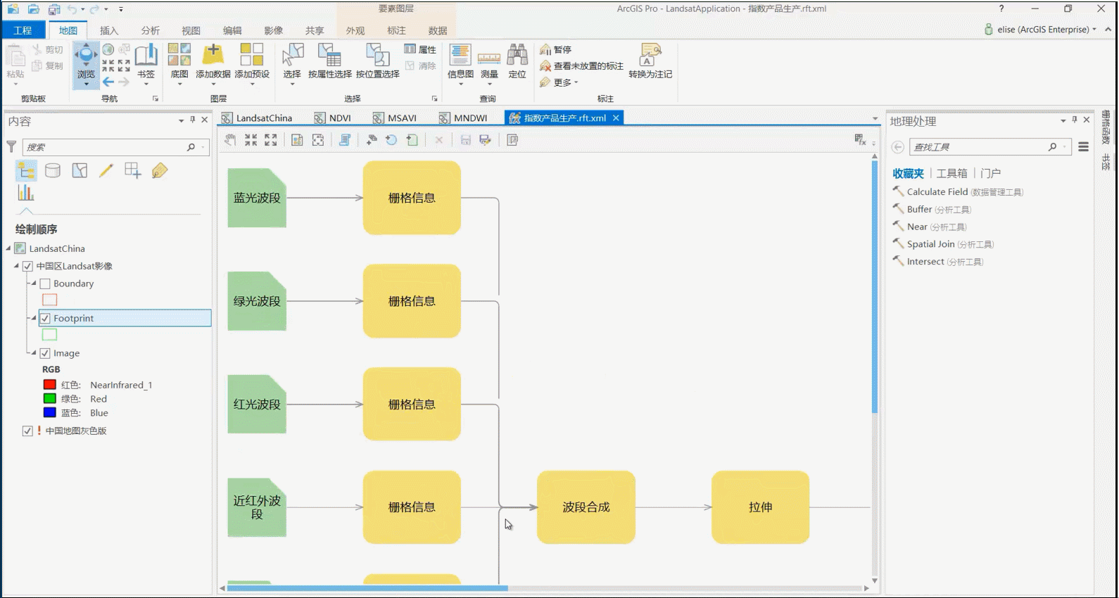除即用型工具外,还可在ArcGIS Pro中对栅格大数据工具进行扩展。ArcGIS Pro提供了灵活的处理方式,可通过栅格函数及其动态模型的构建对大数据分布式处理工具进行定制扩展。演示中以全国560景Landsat影像作为数据源,通过自定义分析模型,调用栅格大数据分布式计算能力,高效实现多源指数产品计算。
