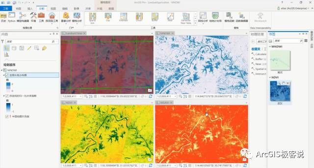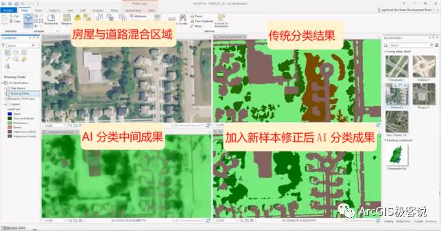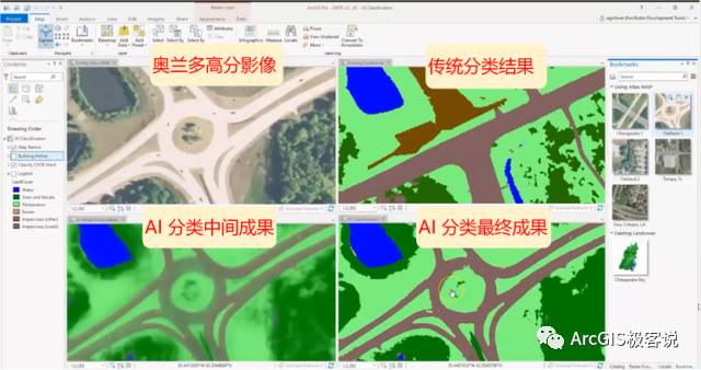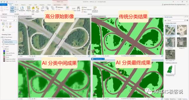 在ArcGIS Pro中,通过四个视窗来对比传统方法与深度学习在高分影像分类中的成果。通过添加大量的海湾地区分类样本,训练后的AI模型保留了传统分类结果的高精度。