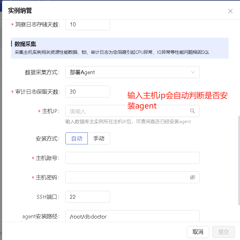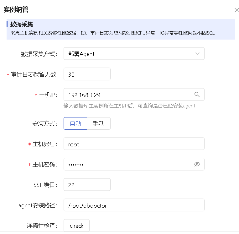 wget http://192.168.3.132:13000/download/agent.tar.gz&&tar -zxvf agent.tar.gz&&cd agent&&./agent --install -h 192.168.3.132 -k 192.168.3.132:9092 -s 192.168.3.132:13000实例纳管步骤