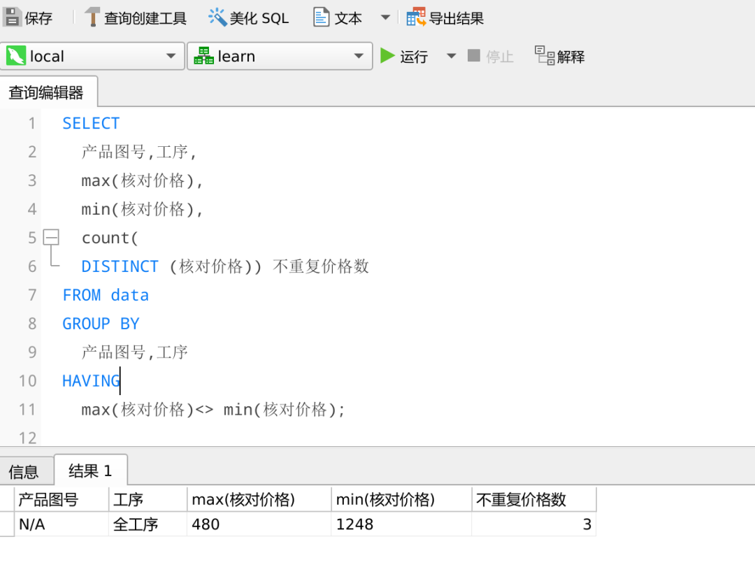 语句看字面就能理解,就是按产品图号,工序分组,筛选出价格的最大值与最小值不等的。那么就是价格不完全相同的产品图号和和工序了。