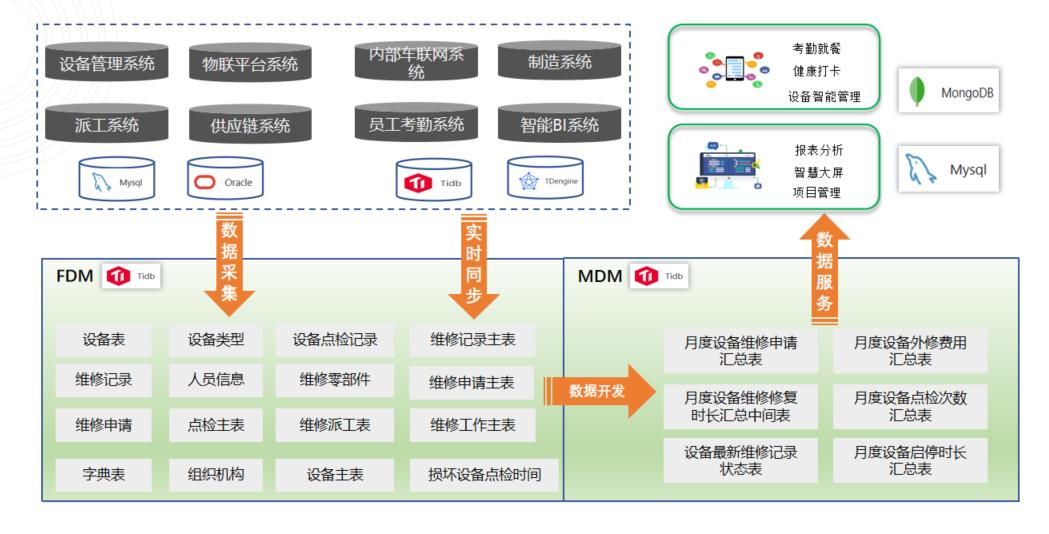 TiDB 集群: 从数据源进行 1:1 复制,转换成结构化数据,存放到实时平台的统一数据缓存层 TiDB 集群,创建基础数据模型,涉及多个基础数据表,如:设备表、维修记录、人员信息、设备点检记录等存储生产数据、设备状态等信息。