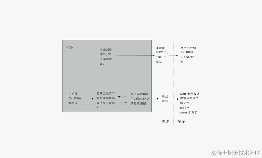 **「ANN是什么?」**为了在规定的耗时约束内完成对亿级候选集的检索,系统通常会使用近似近邻检索(ANN)来避免穷举候选集里所有的广告。常用的树状索引按照向量间的欧式距离将距离近的向量放在索引上相邻的位置。此索引上叶子结点为广告对应的节点,中间节点为聚类产生的没有物理含义的节点。结合宽度为K的Beam Search,则每层索引上需要打分的节点个数小于等于