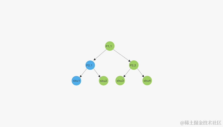 Fig 6: 以一个2叉为例演示了k=1的beam search过程:给节点P2,1和P2,2打分后选取分数更高的P2,1。依次类推最后召回SKU1