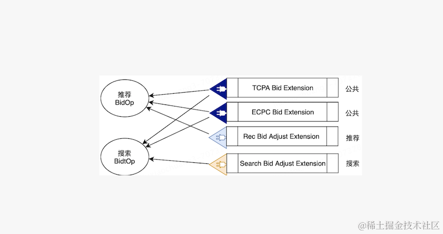 **「可插拔的策略定制」**每个业务算子提供扩展点供业务策略定制,具有可灵活插拔的特性。这样的设计思想是采取类的组合关系+功能分治的思想,将单一的功能点从OP中抽离出来,通过单独的扩展点类来管理,功能上更内聚。