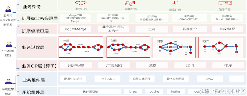 **「业务系统分层」**把在线系统分为系统架构层、业务框架层及业务算法策略定制层,三层迭代相互独立。这样让业务研发专注于业务逻辑编排及策略本身,而系统研发专注于基础架构的优化。