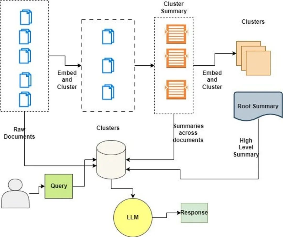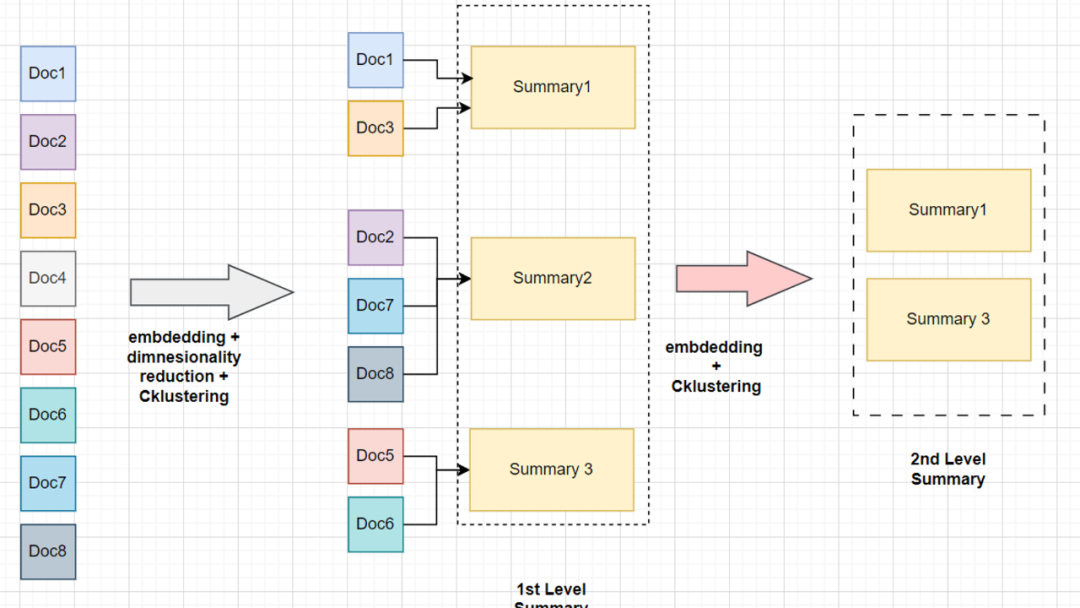 此过程包括将文档分割成称为块的短文本,然后使用嵌入模型对这些块进行处理。接下来,这些嵌入将被聚类算法处理。一旦形成了聚类,就使用大型语言模型(LLM)对每个聚类关联的文本进行总结。