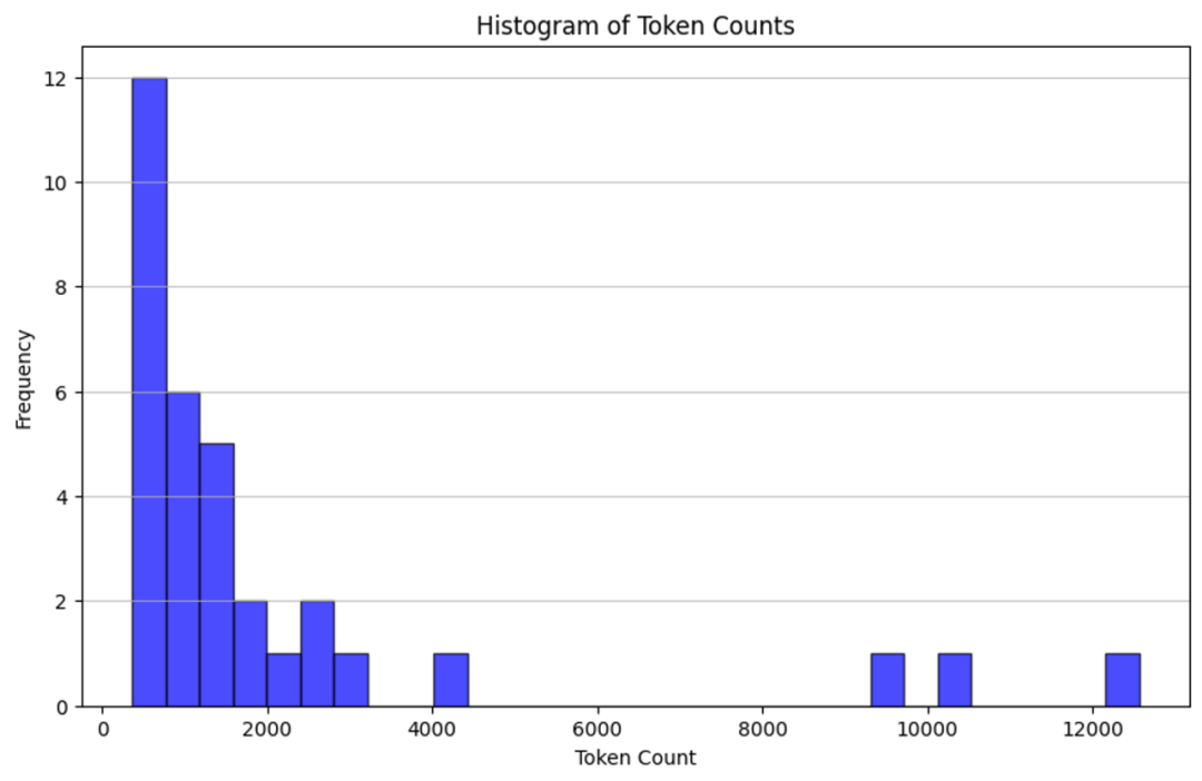 通过计算每篇文档的词元数量并用直方图展示,来检查我们的原始文档大小。