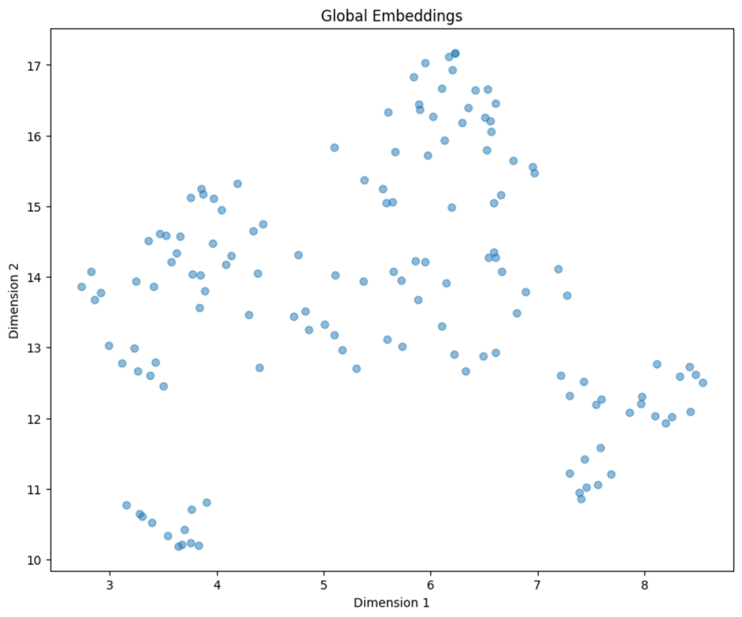 import matplotlib.pyplot as pltfrom typing import Optionalimport numpy as npimport umapdef reduce_cluster_embeddings(embeddings: np.ndarray,dim: int,n_neighbors: Optional[int] = None,metric: str = "cosine",) -> np.ndarray:if n_neighbors is None:n_neighbors = int((len(embeddings) - 1) ** 0.5)return umap.UMAP(n_neighbors=n_neighbors, n_components=dim, metric=metric).fit_transform(embeddings)dim = 2global_embeddings_reduced = reduce_cluster_embeddings(global_embeddings, dim)print(global_embeddings_reduced[0])#plt.figure(figsize=(10, 8))plt.scatter(global_embeddings_reduced[:, 0], global_embeddings_reduced[:, 1], alpha=0.5)plt.title("Global Embeddings")plt.xlabel("Dimension 1")plt.ylabel("Dimension 2")plt.show()