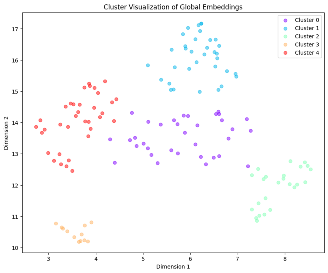 import matplotlib.pyplot as pltimport numpy as npfrom sklearn.mixture import GaussianMixturedef get_optimal_clusters(embeddings: np.ndarray, max_clusters: int = 50, random_state: int = 1234):max_clusters = min(max_clusters, len(embeddings))bics = [GaussianMixture(n_components=n, random_state=random_state).fit(embeddings).bic(embeddings)for n in range(1, max_clusters)]return np.argmin(bics) + 1def gmm_clustering(embeddings: np.ndarray, threshold: float, random_state: int = 0):n_clusters = get_optimal_clusters(embeddings)gm = GaussianMixture(n_components=n_clusters, random_state=random_state).fit(embeddings)probs = gm.predict_proba(embeddings)labels = [np.where(prob > threshold)[0] for prob in probs]return labels, n_clusters#labels, _ = gmm_clustering(global_embeddings_reduced, threshold=0.5)plot_labels = np.array([label[0] if len(label) > 0 else -1 for label in labels])plt.figure(figsize=(10, 8))unique_labels = np.unique(plot_labels)colors = plt.cm.rainbow(np.linspace(0, 1, len(unique_labels)))for label, color in zip(unique_labels, colors):mask = plot_labels == labelplt.scatter(global_embeddings_reduced[mask, 0], global_embeddings_reduced[mask, 1], color=color, label=f'Cluster {label}', alpha=0.5)plt.title("Cluster Visualization of Global Embeddings")plt.xlabel("Dimension 1")plt.ylabel("Dimension 2")plt.legend()plt.show()