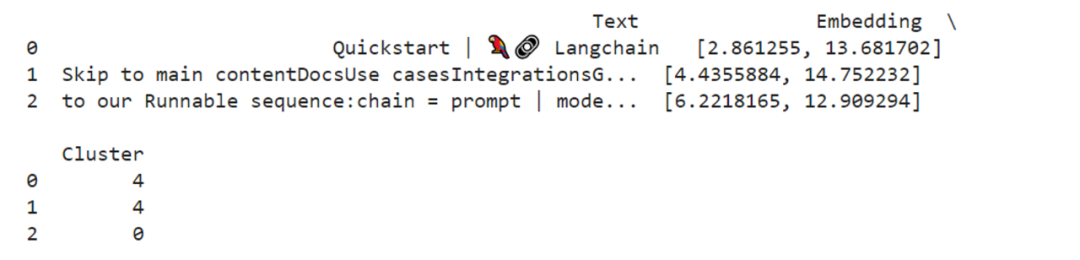 import pandas as pdsimple_labels = [label[0] if len(label) > 0 else -1 for label in labels]df = pd.DataFrame({'Text': texts_split,'Embedding': list(global_embeddings_reduced),'Cluster': simple_labels})print(df.head(3))