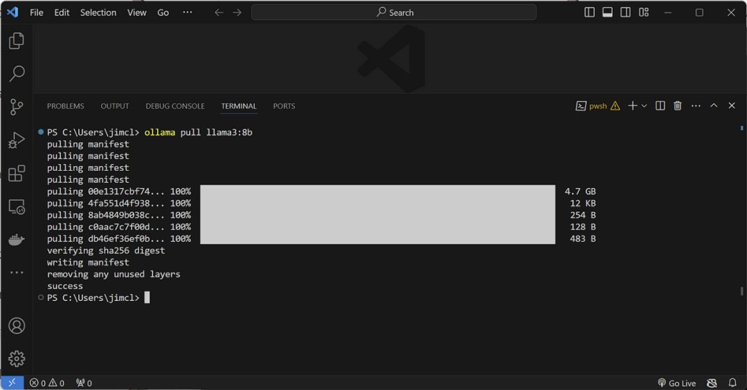 在VS Code的终端里,运行以下命令来下载Llama 3模型: