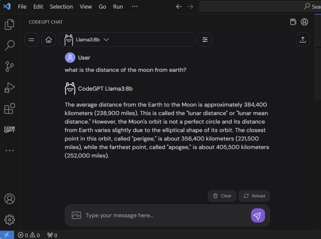 现在我们已经下载了模型并在VS Code上安装了CodeGPT,让我们通过输入一个测试提示来检查一切是否正常工作。