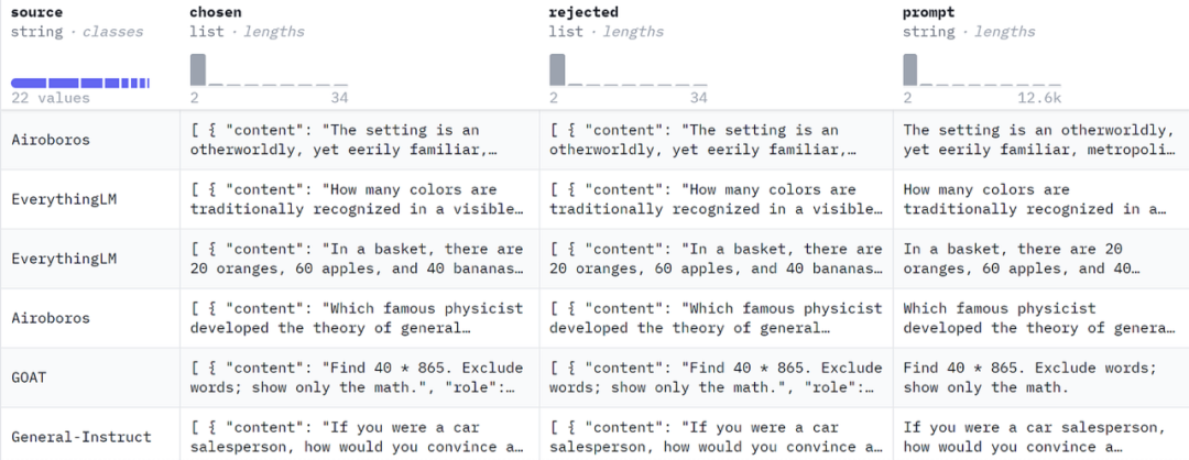 接下来,我们介绍了 ORPO 训练的样本格式,需要包括一个提示、一个首选答案和一个被拒绝的答案。我们使用了 mlabonne/orpo-dpo-mix-40k 数据集,它是几个高质量 DPO 数据集的组合。