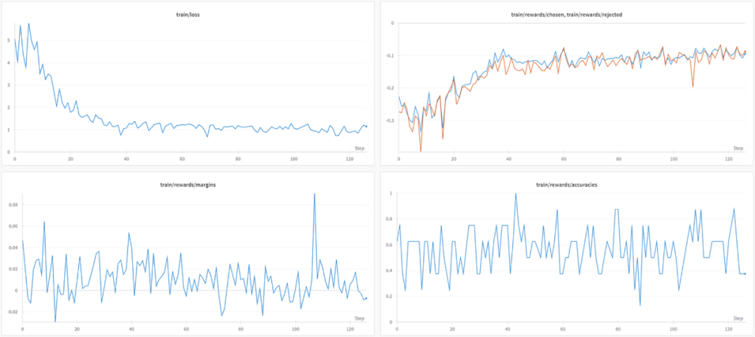虽然损失在下降,但选择和拒绝答案之间的差异并不明显:平均差距和准确率仅略高于零和 0.5。