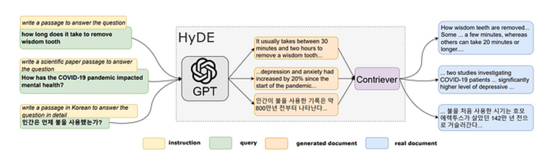 HyDE(即假设文档嵌入)源自Gau 等人在 2022 年论文中提出的创新工作。标题为“无需相关标签的精确零射击密集检索”。这项研究的主要目标是增强依赖于语义嵌入相似性的零样本密集检索。所提出的解决方案 HyDE 通过两步方法运行。