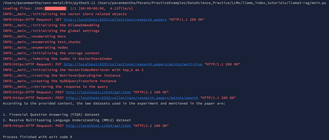 上面的代码首先配置 INFO 级别消息的日志记录,以便可以在输出中看到每个日志,然后继续从本地目录加载 PDF 数据,将其拆分为文本块。它建立了一个 Qdrant 向量存储来存储研究论文嵌入,并初始化 Ollama 文本嵌入模型以从文本生成嵌入。配置全局设置,处理文本块并将其与文档 ID 关联。文本节点是从块创建的,保留元数据,并使用 Ollama 模型为这些节点生成嵌入。然后,该脚本设置一个存储上下文,用于对 Qdrant 向量存储中的文本嵌入进行索引,并继续对它们进行索引。向量检索器被配置为检索相似的嵌入,并且查询引擎被初始化以处理查询。HyDE 查询转换是为了增强查询处理而设置的。最后,执行查询以检索有关论文实验中提到的数据集的信息,并打印响应。