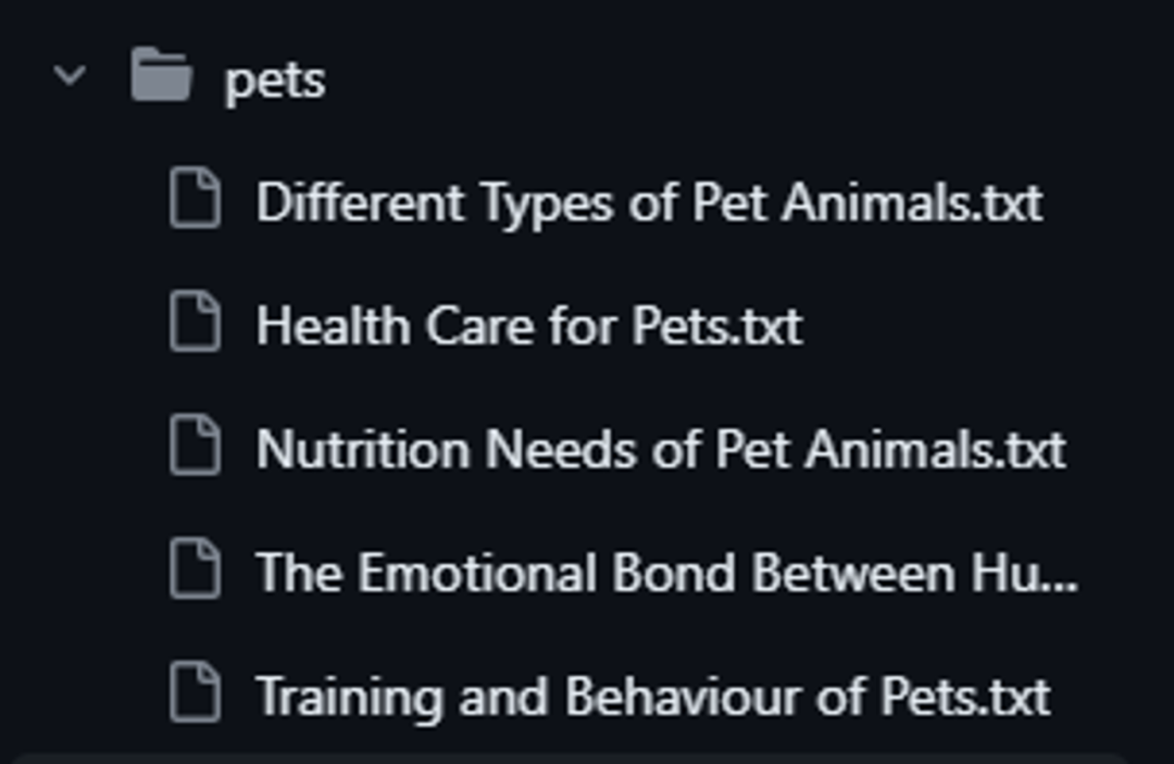 我们将使用带有一些示例文档的“pets”文件夹来解决 ChromaDB 中的语义搜索应用程序。我们在本地文件夹中有以下文件: