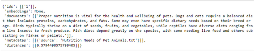# query the database to get the answer from vectorized dataresults = pet_collection.query(query_texts=["What is the Nutrition needs of the pet animals?"],n_results=1)results