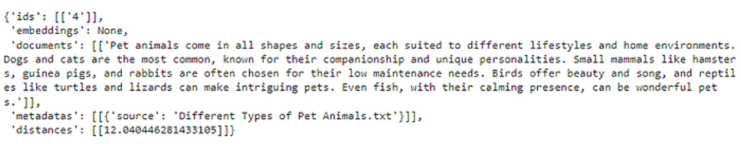 当我们查询集合时,它会自动从嵌入的文档中找到我们查询的最相似的文档,然后生成输出。我们还可以在输出中看到距离指标,该指标显示某个文档与我们的查询的接近程度。